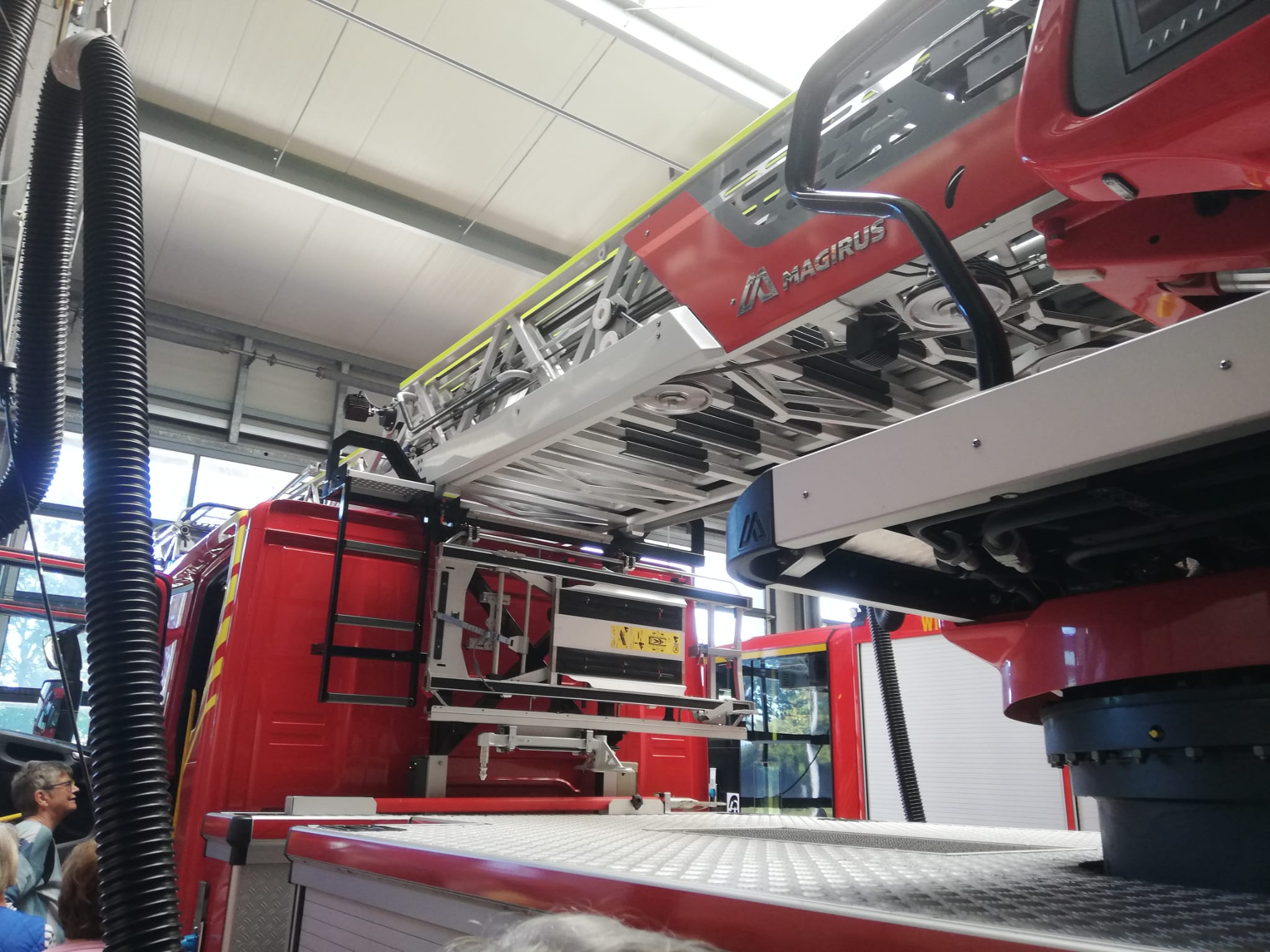 In der Halle stehen die Einsatzwagen bereit, u.a. ein neues Fahrzeug (Preis ca. 1,2 Mio.€) mit einem großen Wassertank, einer 30 m Drehleiter, mit der Personen bis 220 kg geborgen werden können, sowie kompettes Werkzeug zur Bergung.