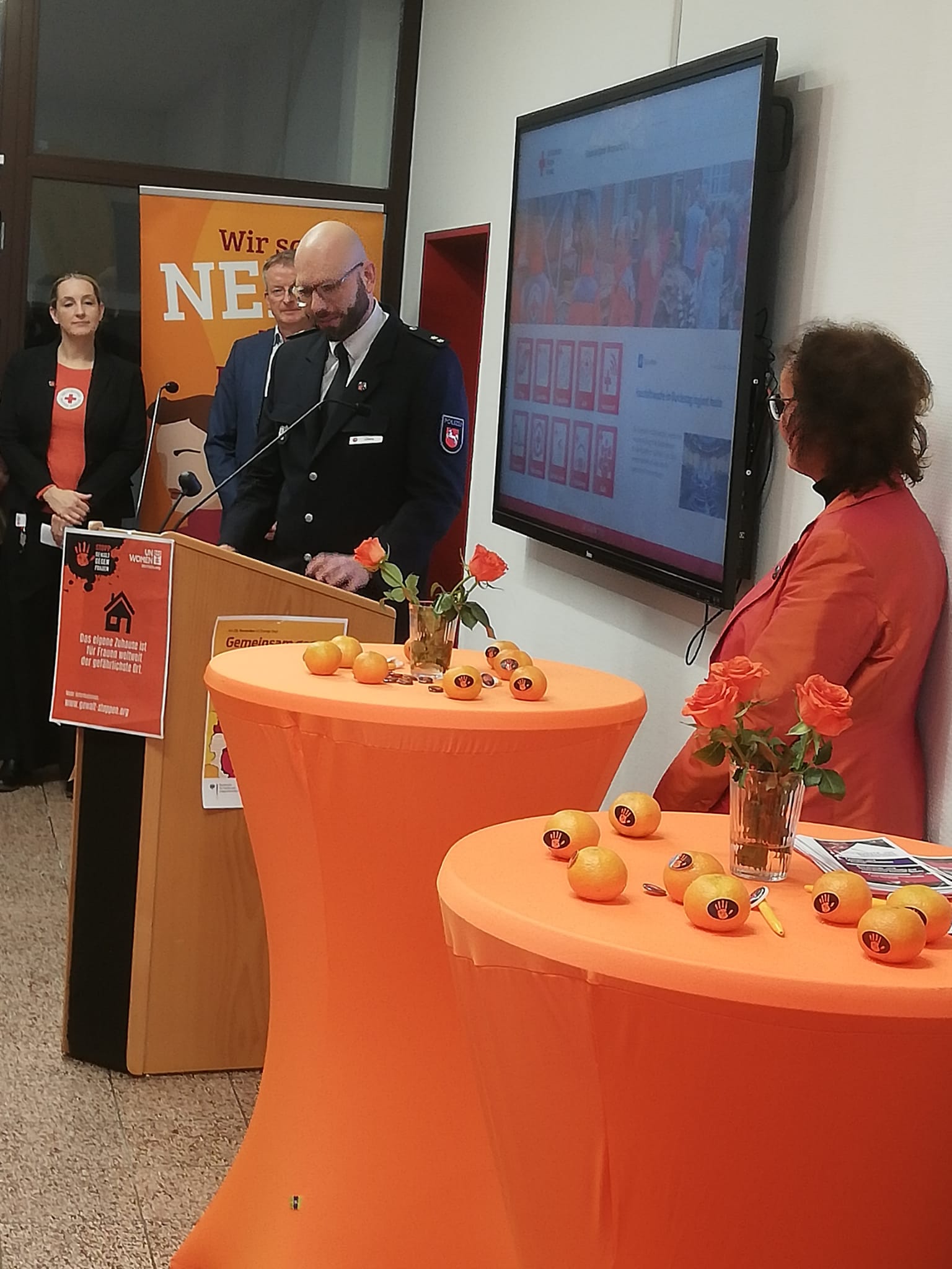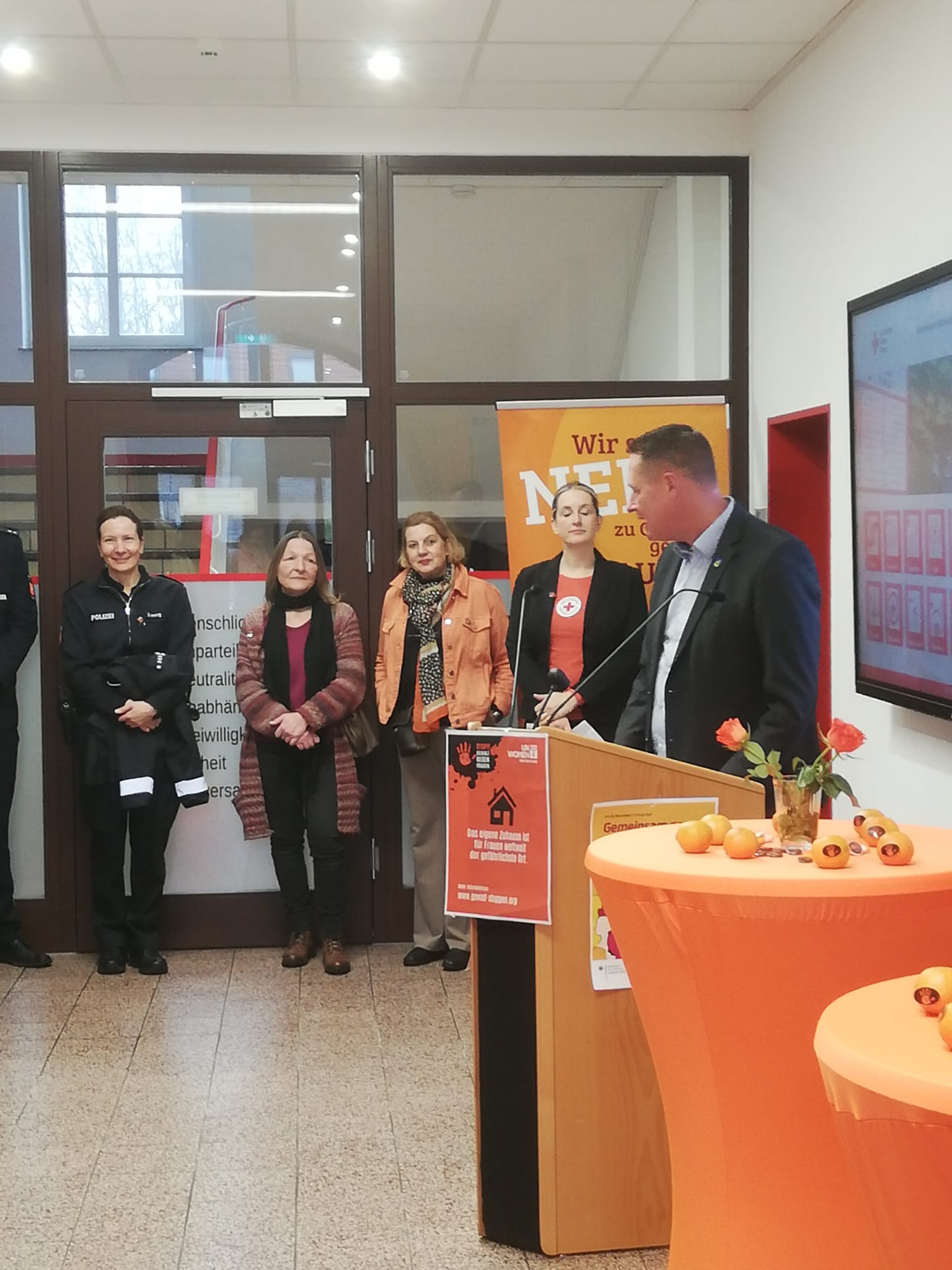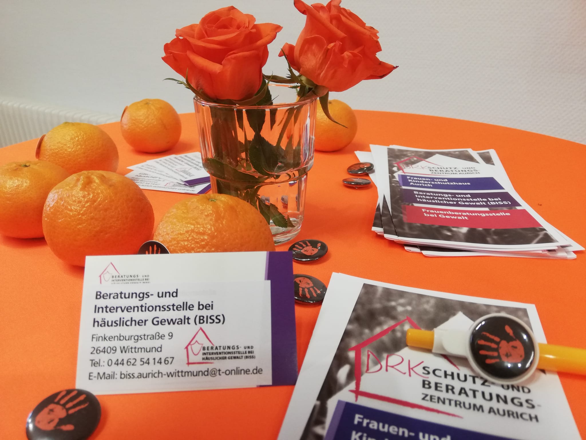 Anläßlich des Internationalen Tages "Gewalt gegen Frauen" (Orange Day) wurde die neue BISS-Beratungsstelle (Beratungs- und Interventionsstelle bei häuslicher Gewalt) im DRK-Kreisverband Wittmund vorgestellt. In ihren Fachbeiträgen machten die Gleichstellungsbeauftragte Ilona Hennig, Landrat Holger Heymann, Bürgermeister Rolf Claußen, der Leiter der Polizei Wittmund Jannes Ulfers sowie Vanessa Maréchal von der BISS-Beratungstelle deutlich, wie wichtig Hilfsangebote, Schutzkonzepte und ein wachsames Umfeld sind. Denn allein im Landkreis Wittmund wurden 130 ! Fälle häuslicher Gewalt bekannt, die Dunkelziffer liegt dabei wesentlich höher.