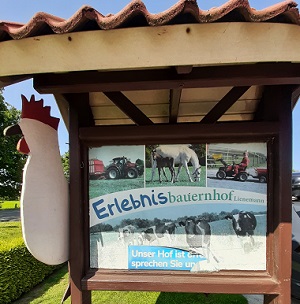 Später bot der Hausherr der Gruppe, die mittlerweile durch 18 Autofahrerinnen ergänzt worden war, eine kleine Führung über seinen Hof. Kühe, Hühner und Pferde, sowie die Erlebnisgastronomie sind die Einnahmequellen der Familie Lienemann, ergänzt durch einen kleinen Hofladen, in dem auch die Eier der 299 Hühner angeboten werden.