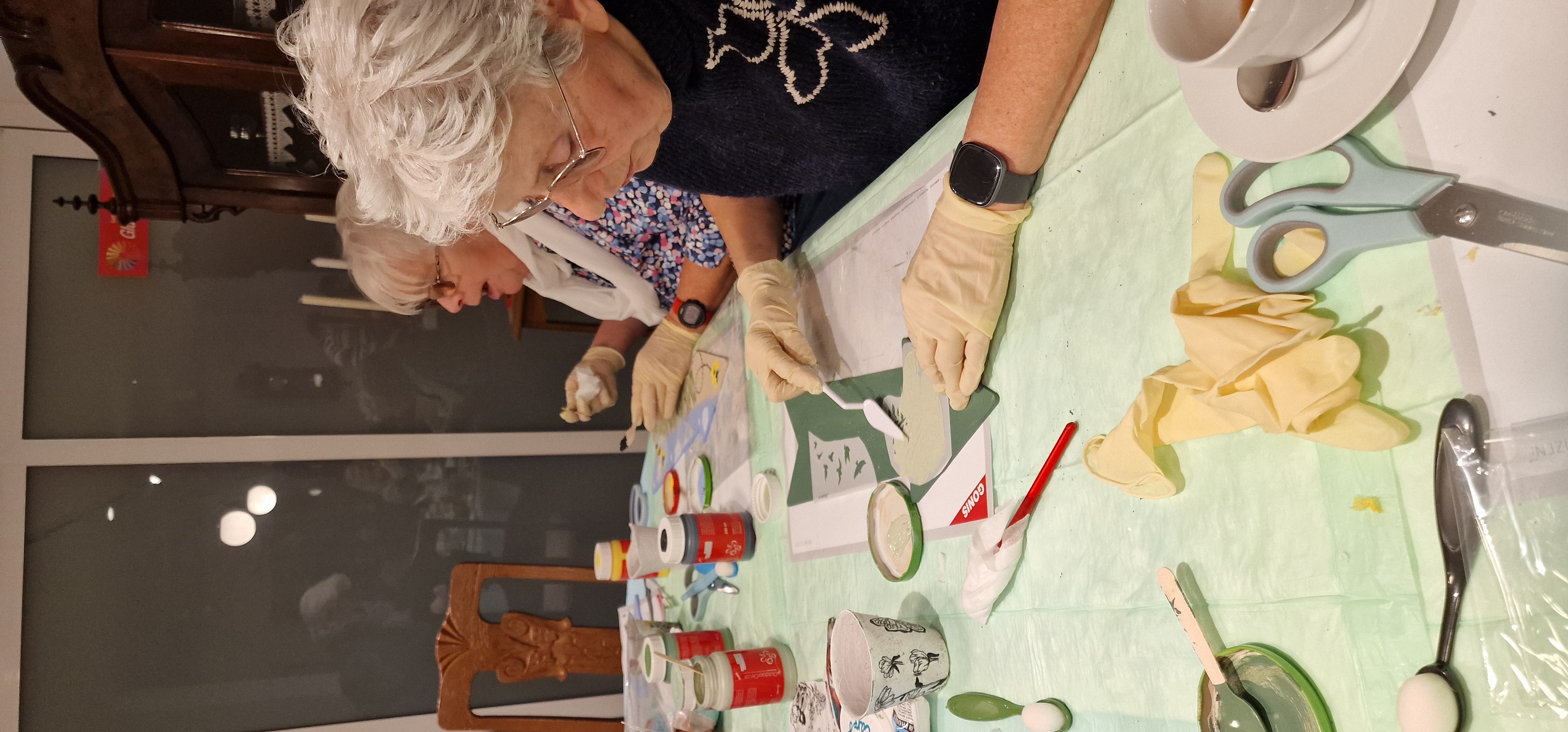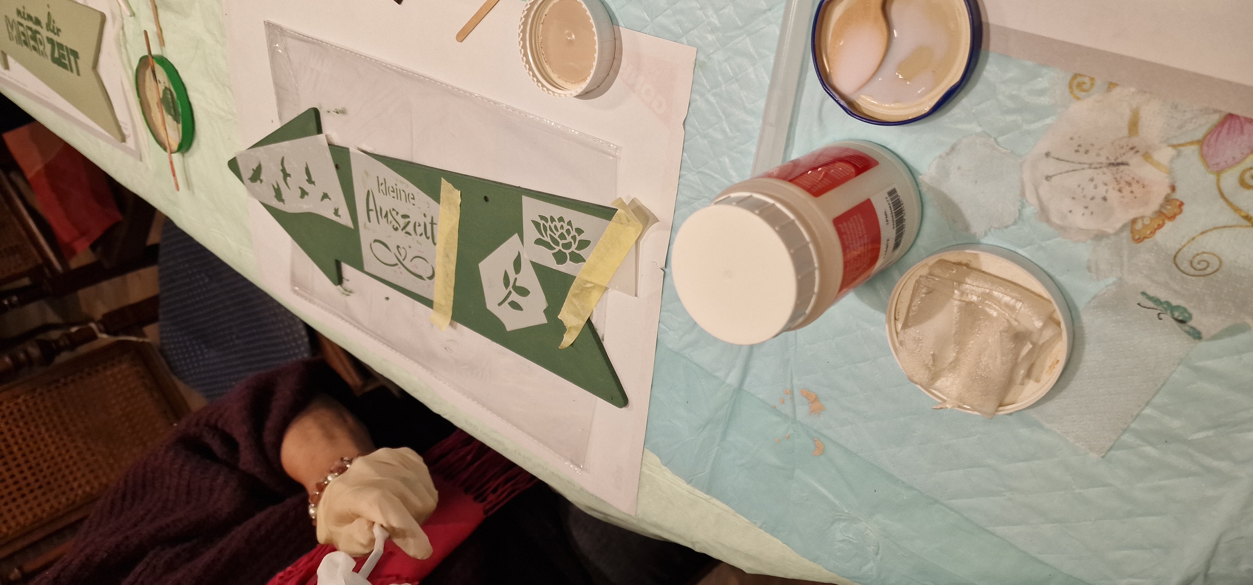 Luise mußte die Teilnehmerinnen nahezu ermahnen, sich zu einer Pause an den gedeckten "Vespertisch" zu setzen, um den Tee, Kaffee und die leckeren Schnittchen zu genießen. Am Ende des Abends konnten alle Teilnehmerinnen ein selbst gestaltetes Ourdoor-Schild für den Garten oder die Terrasse und ein mit Serviettentechnik dekoriertes Osterkörbchen mit nach Hause nehmen.