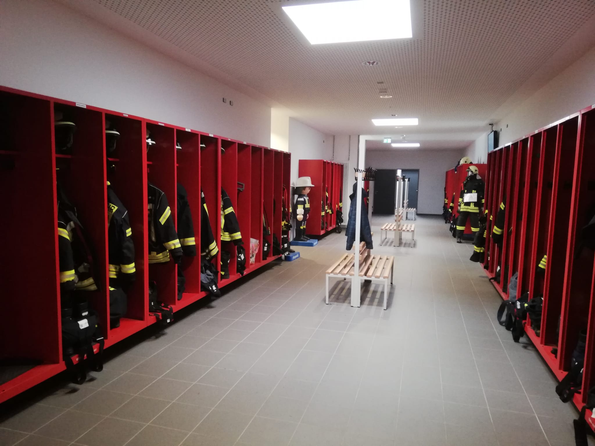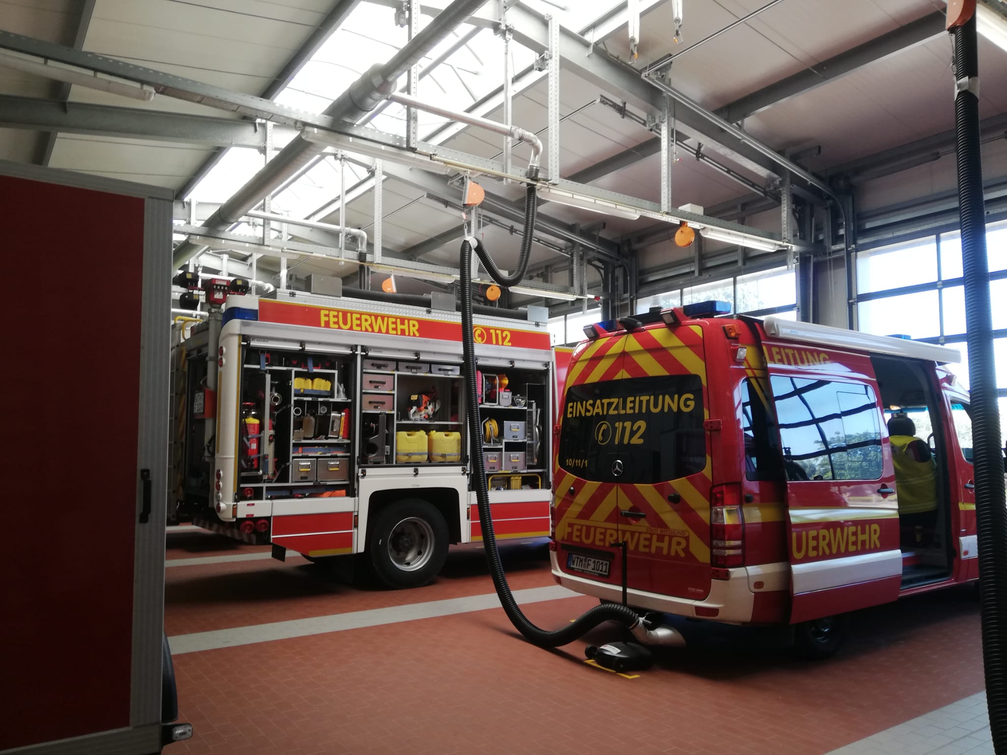 In der Halle stehen die Einsatzwagen bereit, u.a. ein neues Fahrzeug (Preis ca. 1,2 Mio.€) mit einem großen Wassertank, einer 30 m Drehleiter, mit der Personen bis 220 kg geborgen werden können, sowie kompettes Werkzeug zur Bergung.