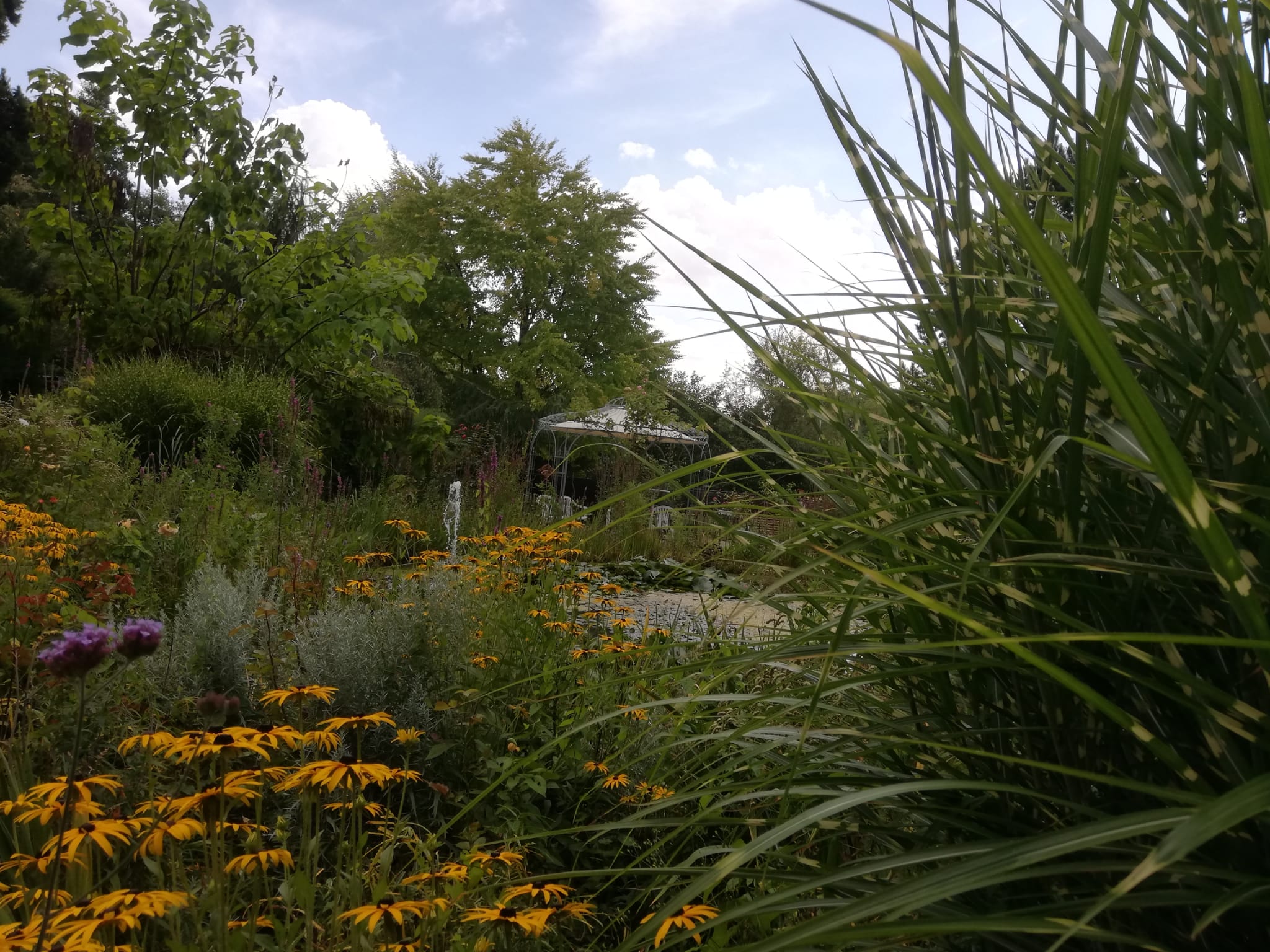 Das letzte Ziel der Reise führte nach Klauhörn in den Garten "Tausendschön" der Familie Gertje. Der 1999 stillgelegte landwirtschafliche Betrieb beherbergt nun ein gemütliches Hofcafe, wo die Reisegruppe mit Tee, Kaffee und einem großen Stück Erdbeerkuchen bedient wurde. Der 6000 Quadratmeter große Garten lädt zum Verweilen ein: Verschlungene Pfade, unzählige liebevoll arrangierte Pflanzengruppen und weite Grünflächen prägen das Bild des großen Gartens, den die Familie nach und nach in Eigenarbeit angelegt hat. Etliche Sitzmöglichkeiten sowie viele zum Gartenbild passende Dekoelemente aus vergangenen Zeiten lenken überall die Blicke auf sich. Auch Wasserspiele und eine große Holzschaukel findet man in dem geschmackvoll angelegten Areal.