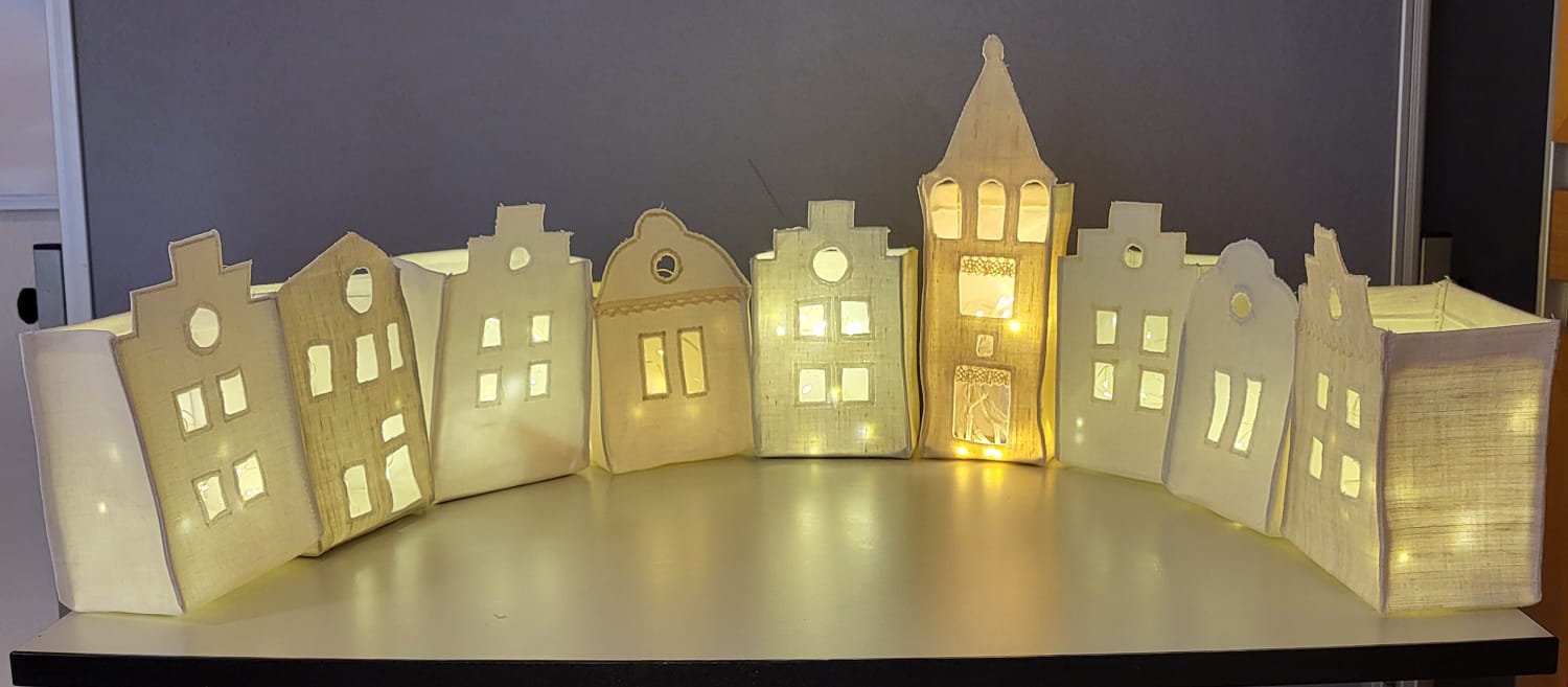 Ein Dorf mit beleuchteten Häusern, genäht unter Anleitung von Helene Fischer von der Patchworkgruppe der Wittmunder LandFrauen